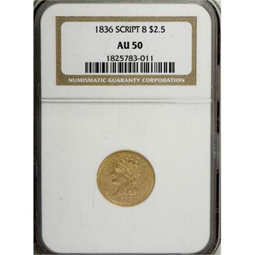 <B>1836 $2 1/2 Script 8 AU50 NGC.</B></I> Head of 1835, Breen-6143, McCloskey-H, R.4. Well struck save for the usual softness at the central devices. This luminous yellow-gold piece shows whispers of lemon near the rims and light abrasions in the fields. A wispy flaw runs parallel to the eagle's right (facing) wing.<BR><BR><B>Coin Engraver:</B> William Kneass<BR><BR><b>Shipping:</b> Coins & Currency (<a target="_blank" href="http://www.heritageauctions.com/common/shipping.php">view shipping information</a>)