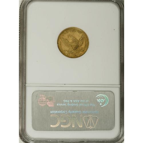 <B>1836 $2 1/2 Script 8 AU53 NGC.</B></I> Head of 1835, Breen-6143, McCloskey-D, R.2. Satin luster shimmers across portions of this lightly abraded green-gold Classic quarter eagle. The left half of the shield has blended detail, but the strike is otherwise sharp, particularly on the stars and dentils.<BR><BR><b>Shipping:</b> Coins & Currency (<a target="_blank" href="http://www.heritageauctions.com/common/shipping.php">view shipping information</a>)