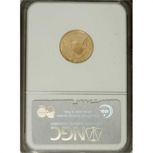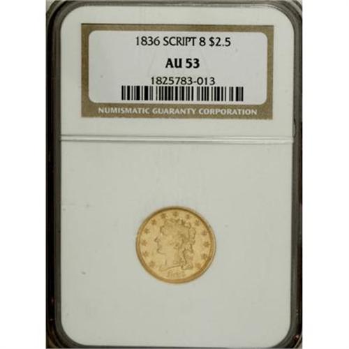 <B>1836 $2 1/2 Script 8 AU53 NGC.</B></I> Head of 1835, Breen-6143, McCloskey-D, R.2. No berry on the olive branch, and a die crack runs through star 6, which is close to Liberty's upper left hair curl. This well struck, lightly worn Classic quarter eagle is primarily yellow-gold with luminous, lightly abraded surfaces.<BR><BR><B>Coin Engraver:</B> William Kneass<BR><BR><b>Shipping:</b> Coins & Currency (<a target="_blank" href="http://www.heritageauctions.com/common/shipping.php">view shipping information</a>)