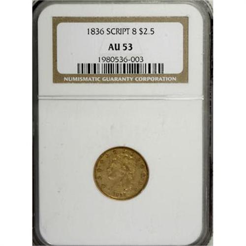 <B>1836 $2 1/2 Script 8 AU53 NGC.</B></I> Head of 1835, Breen-6143, McCloskey-D, R.2. The most available of the Script 8 issues, represented here by an AU53 example. Well struck with a surprisingly deep shade of yellow-gold that offers subtle tinges of green at the luminous margins.<BR><BR><B>Coin Engraver:</B> William Kneass<BR><BR><b>Shipping:</b> Coins & Currency (<a target="_blank" href="http://www.heritageauctions.com/common/shipping.php">view shipping information</a>)