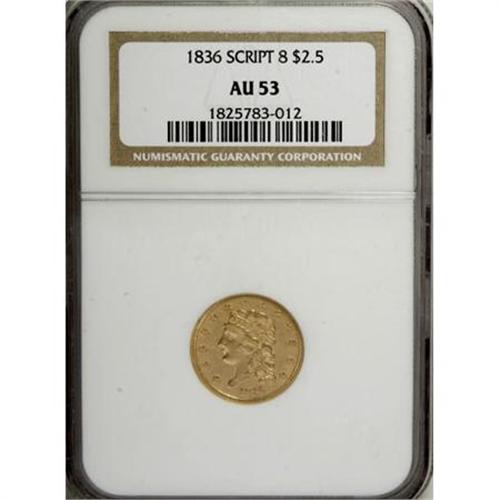 <B>1836 $2 1/2 Script 8 AU53 NGC.</B></I> Head of 1835, Breen-6143, McCloskey-D, R.2. This straw-gold Classic type coin has noticeable remaining luster, particularly within the eagle's wings. A few minor field marks are appropriate for the grade, and the strike is good save for the incompleteness in the centers characteristic of the series. The obverse edge is mildly uneven at 5 o'clock.<BR><BR><B>Coin Engraver:</B> William Kneass<BR><BR><b>Shipping:</b> Coins & Currency (<a target="_blank" href="http://www.heritageauctions.com/common/shipping.php">view shipping information</a>)