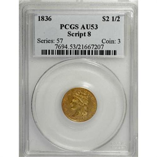 <B>1836 $2 1/2 Script 8 AU53 PCGS.</B></I> Head of 1835, Breen-6143, McCloskey-D, R.2. Attractive yellow-gold and orange-gold shadings converge on this comparatively well-defined Script 8 Classic quarter eagle. Light marks overall with a thin abrasion that curves above the eagle's head.<BR><BR><B>Coin Engraver:</B> William Kneass<BR><BR><b>Shipping:</b> Coins & Currency (<a target="_blank" href="http://www.heritageauctions.com/common/shipping.php">view shipping information</a>)