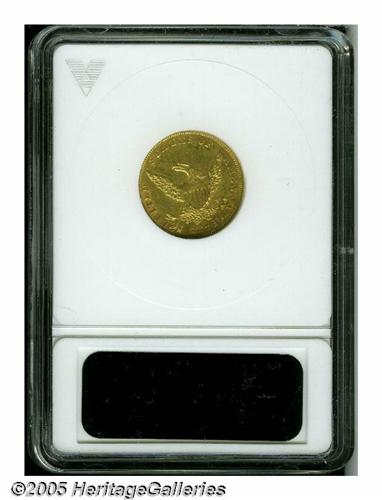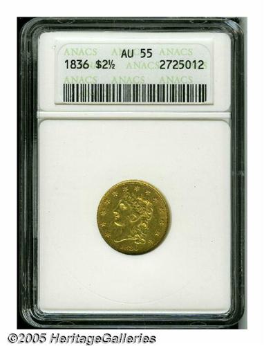 <B>1836<$2 1/2> Script 8 AU55 ANACS.</B></I> McCloskey-D Head of 1835, Breen-6143, R.2. Luster dominates the borders of this reasonably struck golden-honey Quarter Eagle. A few wispy slide marks are encountered in the fields.
