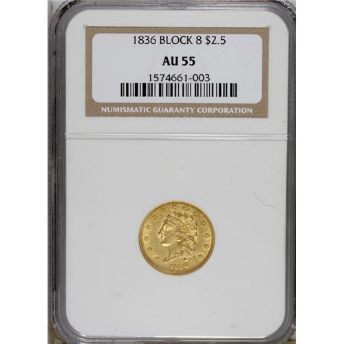 <B>1836 $2 1/2 Script 8 AU55 NGC.</B></I> Head of 1837, Breen-6144, McCloskey-C, R.2. Lustrous for the grade with minor striking softness on the IB in LIBERTY and on the eagle's leg. The fields are slightly bright, but lack identifying marks.<BR><BR><b>Shipping:</b> Coins & Currency (<a target="_blank" href="http://www.heritageauctions.com/common/shipping.php">view shipping information</a>)