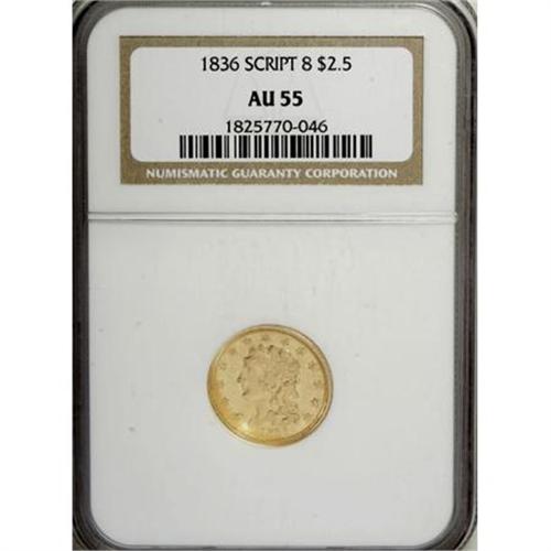 <B>1836 $2 1/2 Script 8 AU55 NGC.</B></I> Head of 1835, Breen-6143, McCloskey-D, R.2. A shining yellow-gold representative that offers significant eye appeal and a handful of scattered abrasions. Minor wear is evident on the well struck devices.<BR><BR><B>Coin Engraver:</B> William Kneass<BR><BR><b>Shipping:</b> Coins & Currency (<a target="_blank" href="http://www.heritageauctions.com/common/shipping.php">view shipping information</a>)