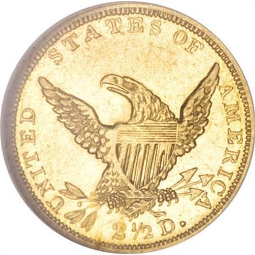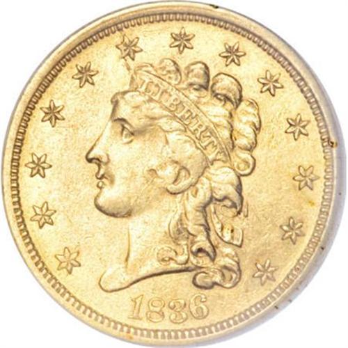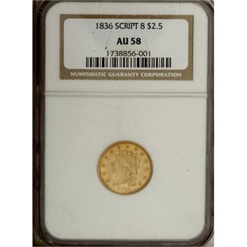 <B>1836 $2 1/2 Script 8 AU58 NGC.</B></I> Head of 1835, Breen-6143, McCloskey-H, R.4 . The Script 8 obverse is also called Head of 1835. On the reverse of this variety, the AM is closely spaced and there is a berry on the branch. Lustrous, deep, mellow orange-gold surfaces display premium eye appeal and relatively few abrasions. Softly struck on the reverse left shield corner and the central hair on the obverse. A die crack connects star 6 to the curl.<BR><BR><B>Coin Engraver:</B> William Kneass<BR><BR><b>Shipping:</b> Coins & Currency (<a target="_blank" href="http://www.heritageauctions.com/common/shipping.php">view shipping information</a>)
