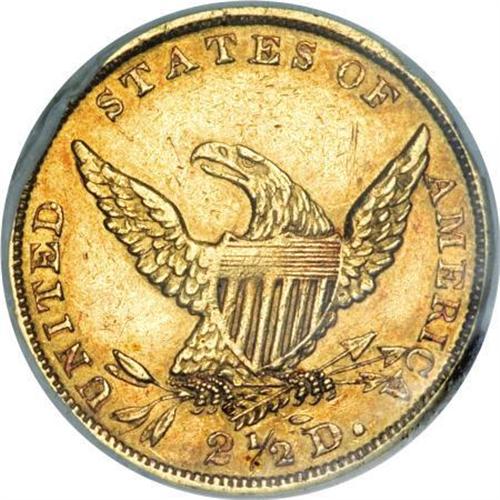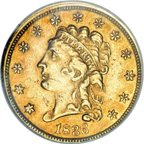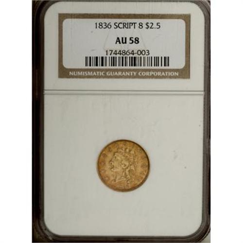 <B>1836 $2 1/2 Script 8 AU58 NGC.</B></I> Head of 1835, Breen-6143, McCloskey-D, R.2. Many examples of the Script 8, Head of 1835 variant show a die crack from star 6 to the nearby hair curl, as does this piece. The beautiful deep orange peripheral color cedes to moderate golden-yellow in the centers. A few light abrasions on the portrait are consistent with the near-Mint State grade.<BR><BR><B>Coin Engraver:</B> William Kneass<BR><BR><b>Shipping:</b> Coins & Currency (<a target="_blank" href="http://www.heritageauctions.com/common/shipping.php">view shipping information</a>)