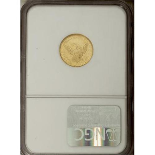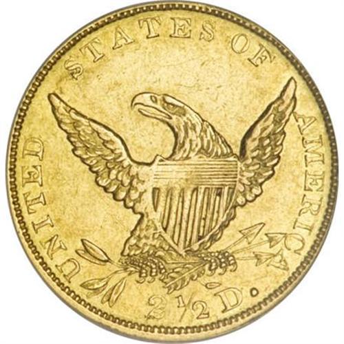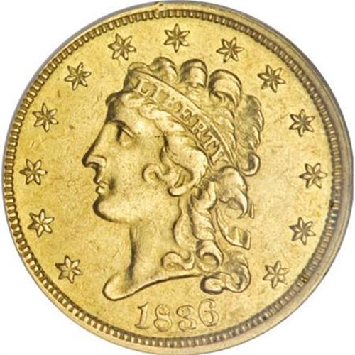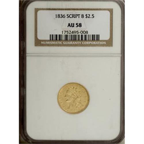 <B>1836 $2 1/2 Script 8 AU58 NGC.</B></I> Head of 1835, Breen-6143, McCloskey-D, R.2. The Head of 1835 has a noticeable bend to the nose of Liberty, whereas the rare Head of 1834 variety has a much straighter nose. This Head of '35 example offers attractive greenish-gold surfaces that display the typical die crack from star 6 to the hair curl nearby.<BR><BR><B>Coin Engraver:</B> William Kneass<BR><BR><b>Shipping:</b> Coins & Currency (<a target="_blank" href="http://www.heritageauctions.com/common/shipping.php">view shipping information</a>)