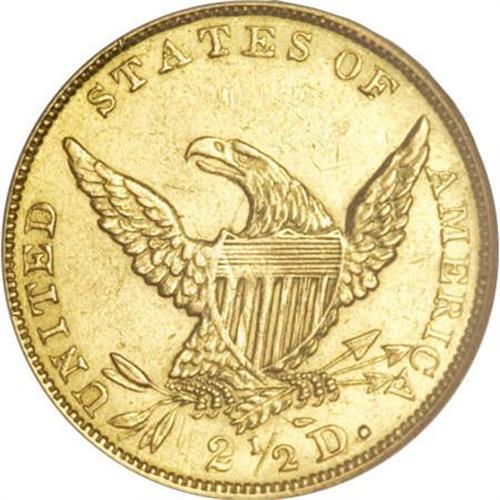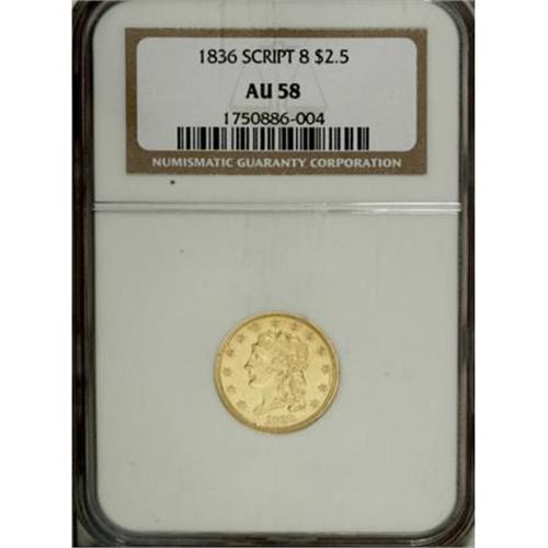 <B>1836 $2 1/2 Script 8 AU58 NGC.</B></I> Head of 1835, Breen-6143, McCloskey-D, R.2. A later die state with several faint reverse die cracks in addition to the usual obverse crack across the portrait. This near-Mint Classic gold coin has substantial luster. The reverse lacks consequential marks, and the obverse abrasions are faded aside from a thin mark near 3 o'clock.<BR><BR><B>Coin Engraver:</B> William Kneass<BR><BR><b>Shipping:</b> Coins & Currency (<a target="_blank" href="http://www.heritageauctions.com/common/shipping.php">view shipping information</a>)