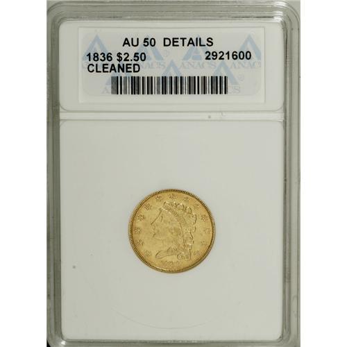 <B>1836 $2 1/2 Script 8--Cleaned--ANACS. AU50 Details.</B></I> NGC Census: (83/778). PCGS Population (55/249). Mintage: 547,986. Numismedia Wsl. Price: $1,165. (#7694)<BR><BR><b>Shipping:</b> Coins & Currency (<a target="_blank" href="http://www.heritageauctions.com/common/shipping.php">view shipping information</a>)