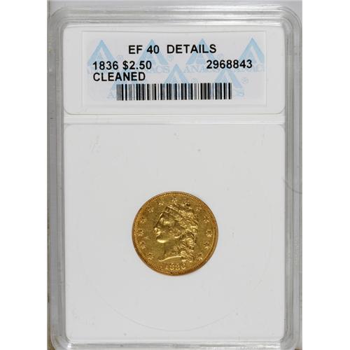 <B>1836 $2 1/2 Script 8--Cleaned--ANACS. XF40 Details.</B></I> NGC Census: (69/1003). PCGS Population (65/347). Mintage: 547,986. Numismedia Wsl. Price for NGC/PCGS coin in XF40: $600. (#7694)<BR><BR><b>Shipping:</b> Coins & Currency (<a target="_blank" href="http://www.heritageauctions.com/common/shipping.php">view shipping information</a>)