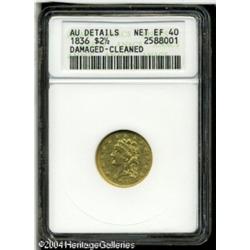 1836 $2 1/2 Script 8--Damaged, Cleaned--ANACS. AU De <B>1836 $2 1/2 Script 8--Damaged, Cleaned--ANACS. AU Details, Net XF40.</B></I> Head of 1835, Breen-6143, McCloskey-D, Breen-6143, R.2. A richly detailed but hairlined canary-gold representative. A handling mark near the neck apparently constitutes the 'damage.' A slender mint-made die crack from 11 to 4 o'clock crosses the portrait. <BR><BR><B>Important notice:</B> Heritage usually auctions material at the rate of 200-250 lots per hour. On some occasions eBay Live bid software or the Internet may not be able to keep up with the pace of the auction. We recommend placing a realistic absentee bid now as insurance to avoid disappointment. Occasionally the auctioneer may eliminate or reject an eBay Live bid, and the auctioneer may also reopen a lot after the close of the eBay live bidding (usually because we missed an audience bid), and may reject your bid even if it shows you as the winning bidder. By bidding via eBay Live, you agree that Heritage may award the lot to another bidder at its sole discretion under the circumstances described above or any other reasonable circumstances. Since eBay bids are not shown to us until we open the lot on the floor, we treat those bids just like floor bids. In most cases the floor responds before the eBay bid is presented to us, due to Internet lag time, so for consistency we have made it a policy that floor bids are always considered first over tie eBay live bids. Also please note that all Heritage lots purchased through eBay Live carry a 20% Buyer's Premium. Please make sure you read the Terms and Conditions before you bid. This lot is being auctioned in conjunction with a live floor auction by Heritage Galleries & Auctioneers. All final auction and invoice information will be supplied by Heritage Galleries & Auctioneers, and all other information should be considered preliminary. Lot:6486
