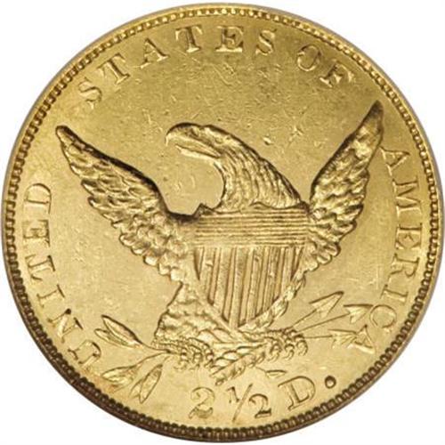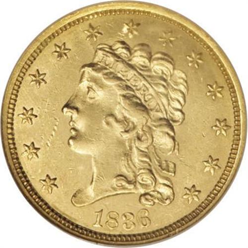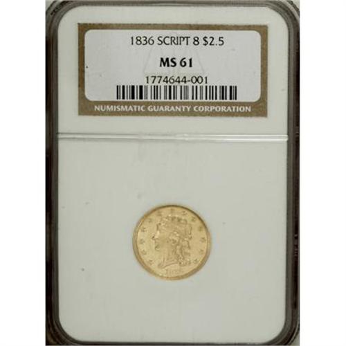 <B>1836 $2 1/2 Script 8 MS61 NGC.</B></I> McCloskey-D, Head of 1835, Breen-6143, R.2. The curl above the ear and the left half of the shield are not fully struck, but this lightly marked type coin has extensive bright luster. A die crack crosses star 6, as made. Three different portrait styles were in use in 1836, although the differences between them are not obvious at first glance.<BR><BR><B>Coin Engraver:</B> William Kneass<BR><BR><b>Shipping:</b> Coins & Currency (<a target="_blank" href="http://www.heritageauctions.com/common/shipping.php">view shipping information</a>)