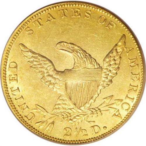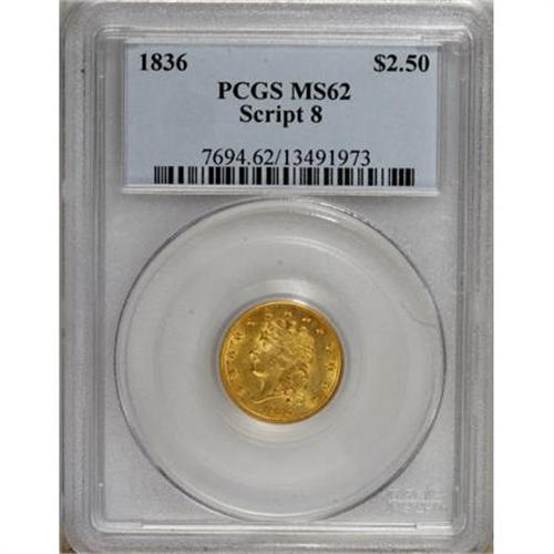 <B>1836 $2 1/2 Script 8 MS62 PCGS.</B></I> Head of 1835, Breen-6143, McCloskey-H, R.4. A scarce variety noted for a widely spaced TAT in STATES and a trio of die cracks that intersect within the hair above the Liberty's ear. An unblemished orange-gold representative with minor incompleteness of strike in the centers.<BR><BR><B>Coin Engraver:</B> William Kneass<BR><BR><b>Shipping:</b> Coins & Currency (<a target="_blank" href="http://www.heritageauctions.com/common/shipping.php">view shipping information</a>)