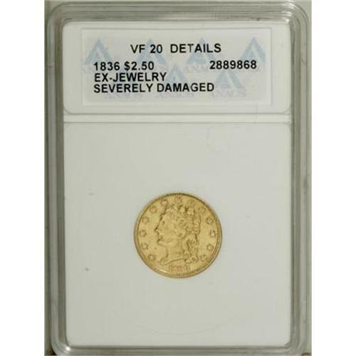 <B>1836 $2 1/2 Script 8--Severely Damaged, Ex-Jewelry--ANACS. VF20 Details.</B></I> NGC Census: (38/1144). PCGS Population (6/483). Mintage: 547,986. Numismedia Wsl. Price: $433. (#7694)<BR><BR><B>Coin Engraver:</B> William Kneass<BR><BR><b>Shipping:</b> Coins & Currency (<a target="_blank" href="http://www.heritageauctions.com/common/shipping.php">view shipping information</a>)