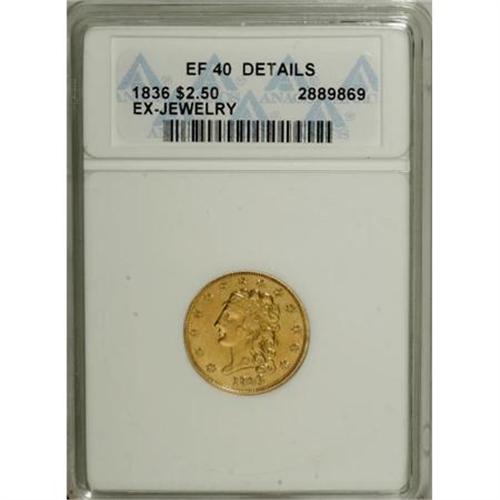 <B>1836 $2 1/2 Script 8--Ex-Jewelry--ANACS. XF40 Details.</B></I> NGC Census: (67/1001). PCGS Population (65/353). Mintage: 547,986. Numismedia Wsl. Price: $600. (#7694)<BR><BR><B>Coin Engraver:</B> William Kneass<BR><BR><b>Shipping:</b> Coins & Currency (<a target="_blank" href="http://www.heritageauctions.com/common/shipping.php">view shipping information</a>)