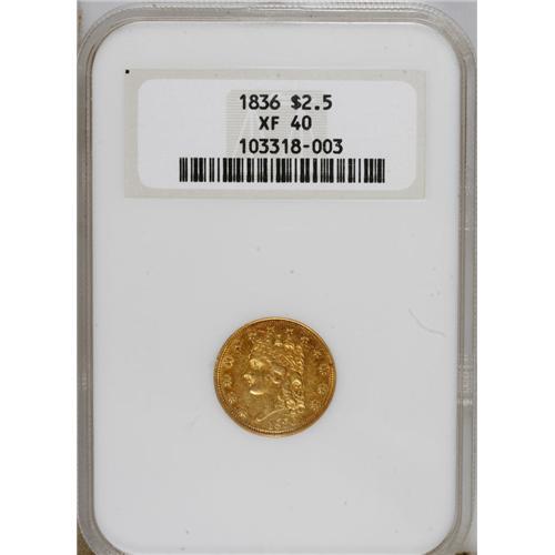 <B>1836 $2 1/2 Script 8 XF40 NGC.</B></I> Head of 1835, Breen-6143, McCloskey-H, R.4. Rose toning visits the borders of this lightly abraded Classic gold coin. Luster outlines the letters and devices. Housed in an early generation NGC holder.<BR><BR><b>Shipping:</b> Coins & Currency (<a target="_blank" href="http://www.heritageauctions.com/common/shipping.php">view shipping information</a>)