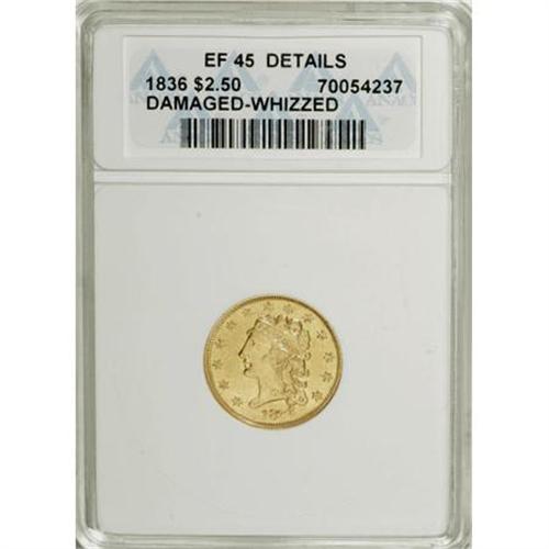 <B>1836 $2 1/2 Script 8--Damaged, Whizzed--ANACS. XF45 Details.</B></I> NGC Census: (142/904). PCGS Population (49/301). Mintage: 547,986. Numismedia Wsl. Price for NGC/PCGS coin in XF45: $826. (#7694)<BR><BR><B>Coin Engraver:</B> William Kneass<BR><BR><b>Shipping:</b> Coins & Currency (<a target="_blank" href="http://www.heritageauctions.com/common/shipping.php">view shipping information</a>)