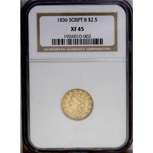 <B>1836 $2 1/2 Script 8 XF45 NGC.</B></I> McCloskey-D, Head of 1835, Breen-6143, R.2. An original olive-gold Classic Quarter Eagle that has the customary striking softness in the centers, although the stars and wings are sharp. A slender crack passes through the sixth star to the bust, as usual for this familiar die pairing.
