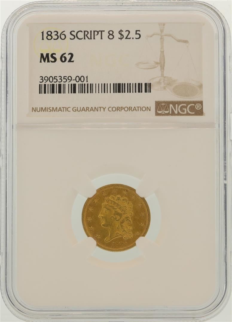 One 1836 $2.5 Liberty Head Quarter Eagle Gold Coin. NGC certified.