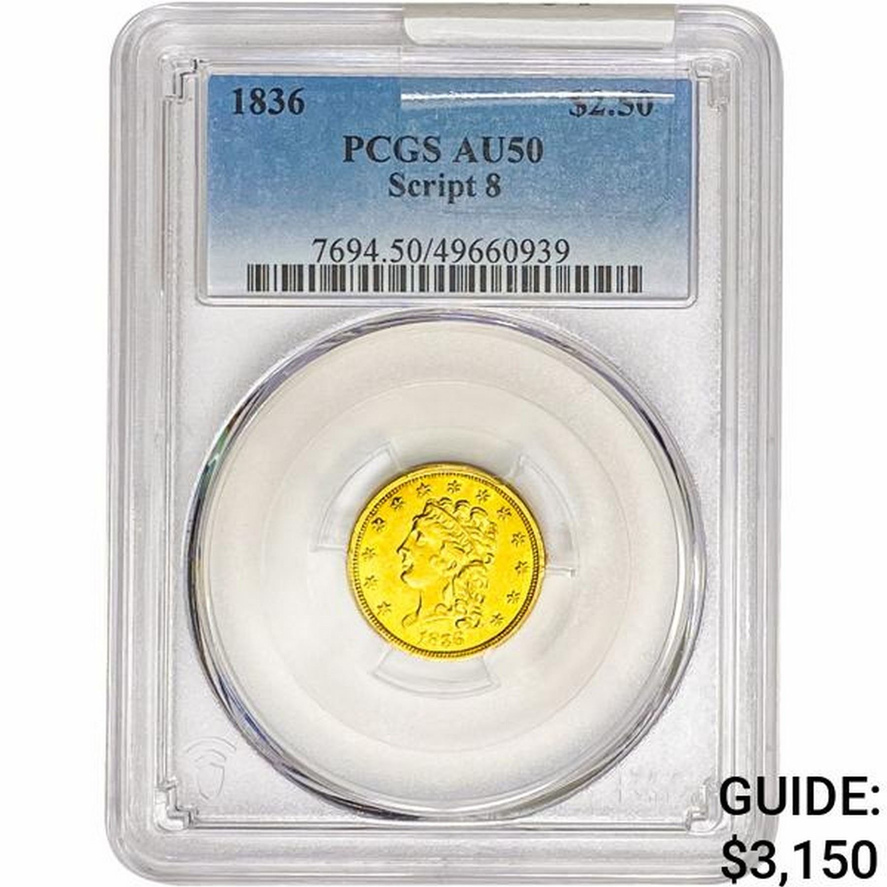 1836 $2.50 Gold Quarter Eagle PCGS AU50 Script 8