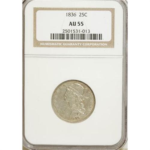 <B>1836 25C AU55 NGC.</B></I> B-1, R.2 Die State. NGC Census: (7/33). PCGS Population (10/31). Mintage: 472,000. Numismedia Wsl. Price for NGC/PCGS coin in AU55: $580. (#5355)<BR><BR><B>Coin Engraver:</B> William Kneass<BR><BR><b>Shipping:</b> Coins & Currency (<a target="_blank" href="http://www.heritageauctions.com/common/shipping.php">view shipping information</a>)