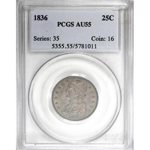 <B>1836 25C AU55 PCGS.</B></I> PCGS Population (10/31). NGC Census: (7/34). Mintage: 472,000. Numismedia Wsl. Price for NGC/PCGS coin in AU55: $580. (#5355)<BR><BR><B>Coin Engraver:</B> William Kneass<BR><BR><b>Shipping:</b> Coins & Currency (<a target="_blank" href="http://www.heritageauctions.com/common/shipping.php">view shipping information</a>)