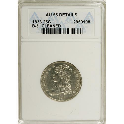 <B>1836 25C --Cleaned--ANACS. AU55 Details.</B></I> B-3, R.1. NGC Census: (7/31). PCGS Population (10/30). Mintage: 472,000. Numismedia Wsl. Price: $580. (#5355)<BR><BR><b>Shipping:</b> Coins & Currency (<a target="_blank" href="http://www.heritageauctions.com/common/shipping.php">view shipping information</a>)