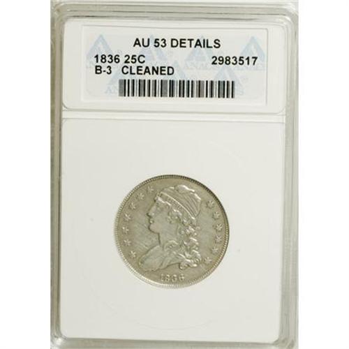 <B>1836 25C --Cleaned--ANACS. AU53 Details.</B></I> B-3. NGC Census: (3/38). PCGS Population (2/41). Mintage: 472,000. Numismedia Wsl. Price for NGC/PCGS coin in AU53: $565. (#5355)<BR><BR><b>Shipping:</b> Coins & Currency (<a target="_blank" href="http://www.heritageauctions.com/common/shipping.php">view shipping information</a>)