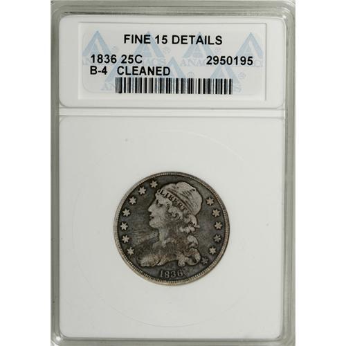 <B>1836 25C --Cleaned--ANACS. Fine 15 Details.</B></I> B-4, R.4. NGC Census: (3/137). PCGS Population (3/87). Mintage: 472,000. Numismedia Wsl. Price: $85. (#5355)<BR><BR><b>Shipping:</b> Coins & Currency (<a target="_blank" href="http://www.heritageauctions.com/common/shipping.php">view shipping information</a>)