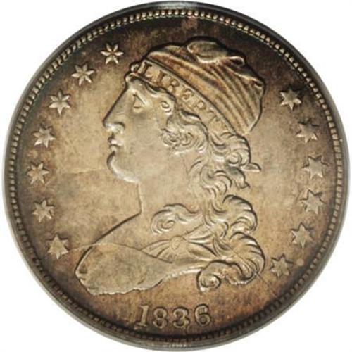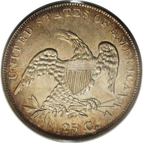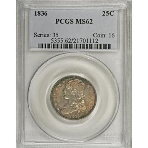 <B>1836 25C MS62 PCGS.</B></I> B-3, R.1. The terminal die state (Breen's VI) with a large die break on Liberty's bust truncation. Both sides display multiple lengthy bold die cracks. A satiny and unmarked Capped Bust type coin with pearl-gray centers and peripheral golden-russet toning. Well struck save for the eagle's beak and right-side stars. Population: 6 in 62, 14 finer (7/07).<BR><BR><B>Coin Engraver:</B> William Kneass<BR><BR><b>Shipping:</b> Coins & Currency (<a target="_blank" href="http://www.heritageauctions.com/common/shipping.php">view shipping information</a>)