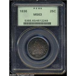 <table><tr><td><TABLE cellSpacing=0 cellPadding=0 width="100%" bgColor=#000000 border=0><TBODY> <TR><TD width="100%"><TABLE cellSpacing=1 cellPadding=3 width="100%" border=0><TBODY><TR><TD width="100%" bgColor=#79735c><FONT face=arial color=#ffffff size=3><B>Description</B> </FONT></TD></TR><TR><TD width="100%" bgColor=#ffffff><FONT face=arial size=2><B>1836 25C MS63 PCGS.</B></I> B-3, R.1. A die crack from 5 o'clock to 11 o'clock bisects the obverse, and that crack is joined by others that wander through the date, the cap, the left side stars, and the bust truncation. The reverse has cracks from 6 to 10 o'clock, with another below the right (facing) wing. Golden-brown and apple-green colors enrich this lovingly preserved Quarter, although a few wispy slide marks are encountered in the central left obverse field. Population: 6 in 63, 5 finer (10/03). </FONT></TD></TR></TBODY></TABLE></TD></TR></TBODY></TABLE><BR><A name=PricesRealized></A><TABLE cellSpacing=0 cellPadding=0 width="100%" bgColor=#000000 border=0><TBODY><TR><TD width="100%"><TABLE cellSpacing=1 cellPadding=3 width="100%" border=0><TBODY><TR><TD width="100%" bgColor=#79735c><A name=PR><FONT face=arial color=#ffffff size=3><B>Previous Prices from Heritage Auctions</B> </FONT></A></TD></TR><TR><TD bgColor=#f6f6ed><TABLE cellSpacing=0 cellPadding=0 width="100%" border=1><TBODY><TR><TD align=middle width="33%"><B>Date</B></TD><TD align=middle width="33%"><B>Service</B></TD><TD align=middle width="33%"><B>Price</B></TD></TR><TR bgColor=whitesmoke><TD width="33%"><B>06/01/1996</B></TD><TD width="33%">NGC</TD><TD width="33%">$1,760.00</TD></TR></TBODY></TABLE></TD></TR><TR><TD bgColor=#ffffff><FONT face=arial size=1 ?>PLEASE NOTE: All prices realized reflect the final hammer price PLUS the buyer's premium in auctions that charge a buyer's premium. Each item has a notation at the top of the listing indicating whether that lot included a buyer's premium. Example: A item that sells with a final hammer price of $100 and a 20% buyer's premium will display with a price realized of $120. All information listed is intended to be as accurate as possible, but errors are possible. Please use this guide carefully and inform us of any inaccuracies. </FONT></TD></TR></TBODY></TABLE></TD></TR></TBODY></TABLE><BR><TABLE cellSpacing=0 cellPadding=0 width="100%" bgColor=#000000 border=0><TBODY><TR><TD width="100%"><TABLE cellSpacing=1 cellPadding=3 width="100%" border=0><TBODY><TR><TD width="100%" bgColor=#79735c colSpan=6><FONT face=arial color=#ffffff size=3><B>Price Guide*</B> </FONT></TD></TR><TR bgColor=#f6f6ed><TD align=middle><B>Grade</B> </TD><TD align=middle><B>Coin World<BR>(Trends)</B> </TD><TD align=middle><B>Numismedia<BR>Retail</B> </TD><TD align=middle><B>Numismedia<BR>Wholesale</B> </TD><TD align=middle><B>Coin<BR>Universe</B> </TD><TD align=middle><B>Heritage<BR>Value Index</B> </TD></TR><TR bgColor=#ffffff><TD align=middle>62</TD><TD align=right>$1,800.00</TD><TD align=right>---</TD><TD align=right>$895.00</TD><TD align=right>$1,575.00</TD><TD align=right>$1,290.00</TD></TR><TR style="FONT-WEIGHT: bold" bgColor=#cccfdd><TD align=middle>63</TD><TD align=right>$3,250.00</TD><TD align=right>---</TD><TD align=right>$2,250.00</TD><TD align=right>$3,125.00</TD><TD align=right>$2,035.63</TD></TR><TR bgColor=#ffffff><TD align=middle>64</TD><TD align=right>$5,750.00</TD><TD align=right>---</TD><TD align=right>$6,325.00</TD><TD align=right>$7,425.00</TD><TD align=right>$4,499.17</TD></TR><TR bgColor=#ffffff><TD colSpan=6><FONT size=1>*All information listed is intended to be as accurate as possible, but errors are possible. No item may be returned or refused based on this information which is provided as a service to our customers. You should contact each pricing source directly to determine the accuracy of this information. </FONT></TD></TR></TBODY></TABLE></TD></TR></TBODY></TABLE><BR><TABLE cellSpacing=0 cellPadding=0 width="100%" bgColor=#000000 border=0><TBODY><TR><TD width="100%"><TABLE cellSpacing=1 cellPadding=3 width="100%" border=0><TBODY><TR><TD width="100%" bgColor=#79735c><FONT face=arial color=#ffffff size=3><B>Population Guide</B> </FONT></TD></TR><TR bgColor=#ffffff><TD align=middle><!-- Begin Output of Population Grid--><TABLE cellSpacing=0 cellPadding=0 width="100%" border=0><TBODY><TR><TD vAlign=center><TABLE cellSpacing=0 width="100%" border=1 cellsadding="3"><TBODY><TR><TD vAlign=center><TABLE cellSpacing=0 cellPadding=3 width="100%" border=1><TBODY><TR><TD vAlign=center align=middle bgColor=#f0f1e8 colSpan=2 <CENTER><FONT face=Arial size=2><B>PCGS Pop </B></FONT><CENTER></CENTER></TD><TD vAlign=center align=middle bgColor=#f0f1e8 colSpan=2><CENTER><FONT face=Arial size=2><B>NGC Pop</B></CENTER></FONT></TD></TR><TR><TD vAlign=center><FONT face=Arial size=2>(63)</FONT> </TD><TD vAlign=center align=right><FONT face=Arial size=2>6</FONT> </TD><TD vAlign=center><FONT face=Arial size=2>(63)</FONT> </TD><TD vAlign=center align=right><FONT face=Arial size=2>5</FONT> </TD></TR><TR><TD vAlign=center><FONT face=Arial size=2>(>63)</FONT> </TD><TD vAlign=center align=right><FONT face=Arial size=2>5</FONT> </TD><TD vAlign=center><FONT face=Arial size=2>(>63)</FONT> </TD><TD vAlign=center align=right><FONT face=Arial size=2>13</FONT> </TD></TR></TBODY></TABLE></TD></TR></TBODY></TABLE></TD></TR></TBODY></TABLE><!-- End Output of Population Grid--></TD></TR></TBODY></TABLE></TD></TR></TBODY></TABLE><BR><TABLE cellSpacing=0 cellPadding=0 width="100%" bgColor=#000000 border=0><TBODY><TR> Important notice: Heritage usually auctions material at the rate of 200-250 lots per hour. On some occasions eBay Live bid software or the Internet may not be able to keep up with the pace of the auction. We recommend placing a realistic absentee bid now as insurance to avoid disappointment. Occasionally the auctioneer may eliminate or reject an eBay Live bid, and the auctioneer may also reopen a lot after the close of the eBay live bidding (usually beca