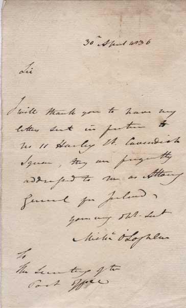 Letter dated 30 April 1836 written by Sir Michael O'Loghlen, Attorney General for Ireland, a distinguished judge, first Catholic to be raised to the high office of Master of the Rolls and a legal advisor to Daniel O'Connell. A memorial stands to him in the foyer of the courthouse in Ennis, County Clare