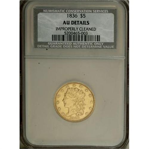<B>1836 $5 --Improperly Cleaned--NCS. AU Details.</B></I> NGC Census: (0/0). PCGS Population (0/0). Mintage: 553,147. (#8174)<BR><BR><B>Coin Engraver:</B> William Kneass<BR><BR><b>Shipping:</b> Coins & Currency (<a target="_blank" href="http://www.heritageauctions.com/common/shipping.php">view shipping information</a>)