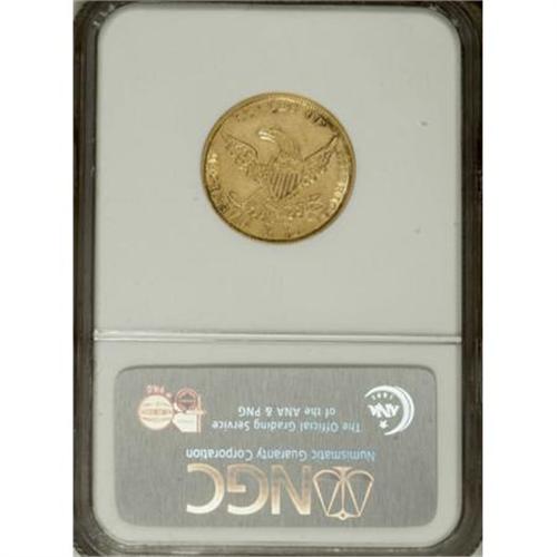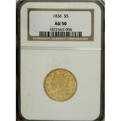 <B>1836 $5 AU50 NGC.</B></I> Small Head, Large Date, Breen-6508, McCloskey 5-D, R.3. The 1 and 8 in the date are of roughly equal height, and on the reverse, the TES of STATES is narrow while the word OF is widely spaced. A well struck yellow-gold and orange-gold piece that shows small areas of wear at Liberty's brow and the eagle's upper wings.<BR><BR><B>Coin Engraver:</B> William Kneass<BR><BR><b>Shipping:</b> Coins & Currency (<a target="_blank" href="http://www.heritageauctions.com/common/shipping.php">view shipping information</a>)