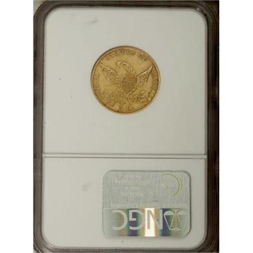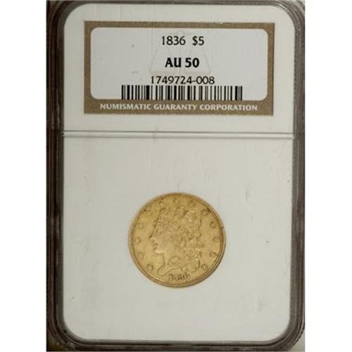 <B>1836 $5 AU50 NGC.</B></I> Second Head, Large Date, McCloskey 4-D, R.3. Rich antique-gold surfaces are clean, albeit it a smidgen dull. Some earthy residue in the most protected areas attests to the originality. A scarcer variety of this otherwise available issue that is popular for Classic Head type purposes.<BR><BR><B>Coin Engraver:</B> William Kneass<BR><BR><b>Shipping:</b> Coins & Currency (<a target="_blank" href="http://www.heritageauctions.com/common/shipping.php">view shipping information</a>)
