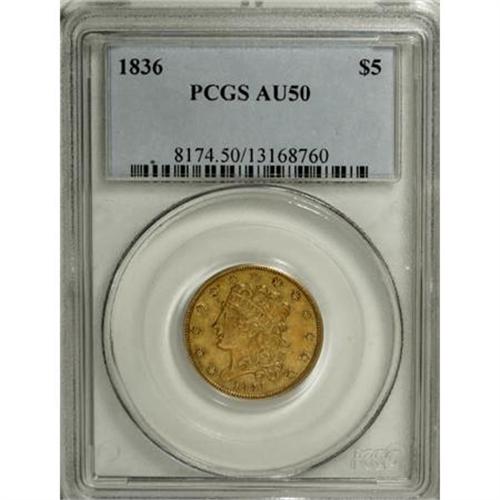 <B>1836 $5 AU50 PCGS.</B></I> Small Head, Large Date, Breen-6508, McCloskey 5-D, R.3. This green-gold example has the unscrubbed "dirty gold" appearance desired by experienced gold collectors. The fields are surprisingly unabraded, and the portrait has only minor contact on the nose and jaw.<BR><BR><B>Coin Engraver:</B> William Kneass<BR><BR><b>Shipping:</b> Coins & Currency (<a target="_blank" href="http://www.heritageauctions.com/common/shipping.php">view shipping information</a>)