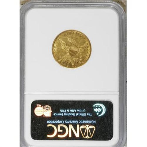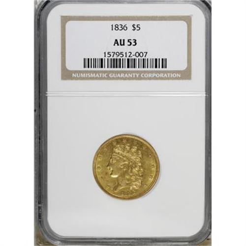 <B>1836 $5 AU53 NGC.</B></I> Breen-6509, Second Head, Large Date, McCloskey 6-E, R.4. Nearly full details are seen on both sides, along with light hairline scratches. Pleasantly colored a baroque-gold with some luster remaining in the protected areas.<BR><BR><B>Coin Engraver:</B> William Kneass<BR><BR><b>Shipping:</b> Coins & Currency (<a target="_blank" href="http://www.heritageauctions.com/common/shipping.php">view shipping information</a>)