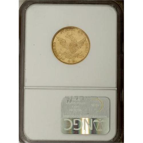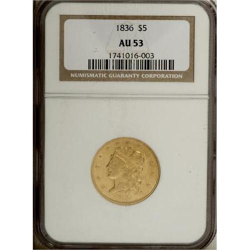 <B>1836 $5 AU53 NGC.</B></I> Second Head, Large Date, Breen-6509, McCloskey 2-A, R.4. Pleasant reflectivity in the fields is noted as is a satisfying orange-gold color. A scarce die pairing that currently carries little premium, but may in the future, once specialist knowledge of the series is better diffused.<BR><BR><B>Coin Engraver:</B> William Kneass<BR><BR><b>Shipping:</b> Coins & Currency (<a target="_blank" href="http://www.heritageauctions.com/common/shipping.php">view shipping information</a>)