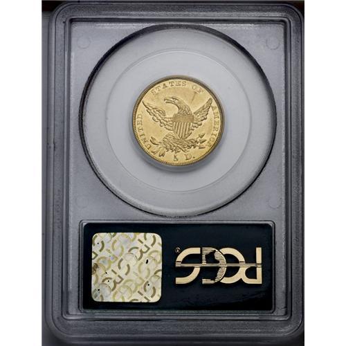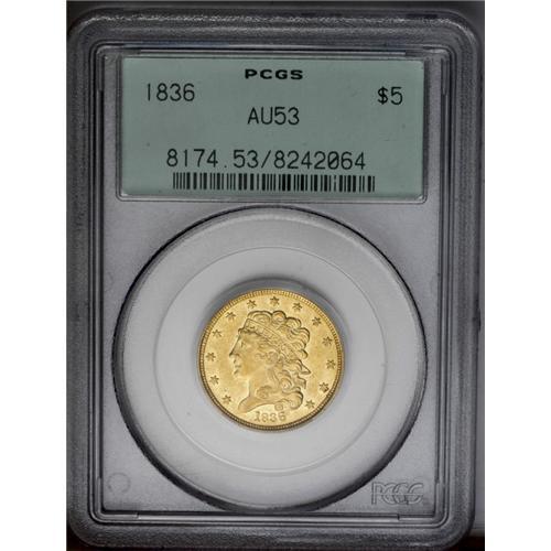 <B>1836<$5> AU53 PCGS.</B></I> Breen-6509, Second Head, Large Date, McCloskey 4-D, R.3. This beautiful Classic gold type coin is meticulously struck and is void of detectable marks. Luster fills the legends and devices. Certified in an old green label holder.<BR><I>From The Chief Paduke Collection.</B></I>