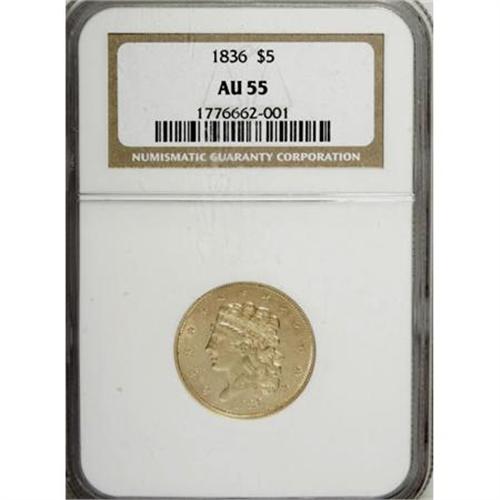 <B>1836 $5 AU55 NGC.</B></I> Second Head, Large Date, Breen-6509, McCloskey 2-B, R.4. Soft, pleasing luster remains in the fields despite a touch of highpoint wear. Softly struck as usual, though the coin retains ample visual appeal.<BR><BR><B>Coin Engraver:</B> William Kneass<BR><BR><b>Shipping:</b> Coins & Currency (<a target="_blank" href="http://www.heritageauctions.com/common/shipping.php">view shipping information</a>)