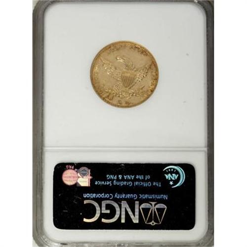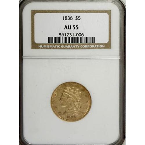 <B>1836 $5 AU55 NGC.</B></I> Third Head, Breen-6510, McCloskey 3-C, R.2. Blushes of orange-rose appear at the lower reverse of this otherwise pale yellow-gold example. Typical definition overall with a number of wispy marks in the fields, yet the coin retains significant eye appeal.<BR><BR><B>Coin Engraver:</B> William Kneass<BR><BR><b>Shipping:</b> Coins & Currency (<a target="_blank" href="http://www.heritageauctions.com/common/shipping.php">view shipping information</a>)