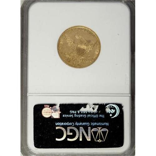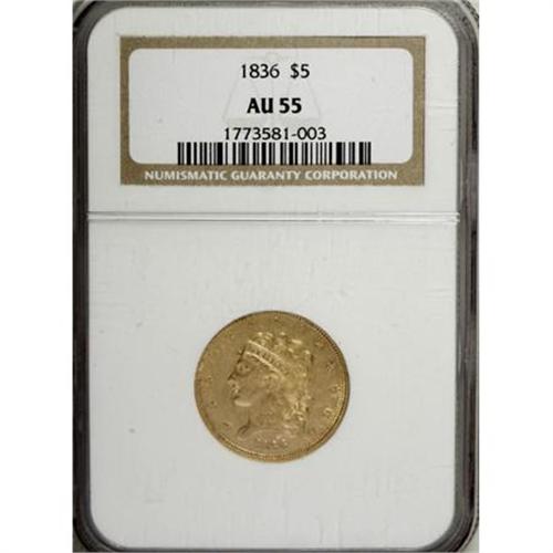<B>1836 $5 AU55 NGC.</B></I> Second Head, Large Date, Breen-6509, McCloskey 4-C, R.3. A mildly lustrous example that shows hints of wheat against pale yellow-gold surfaces. Minor marks and a touch of wear account for the designation.<BR><BR><B>Coin Engraver:</B> William Kneass<BR><BR><b>Shipping:</b> Coins & Currency (<a target="_blank" href="http://www.heritageauctions.com/common/shipping.php">view shipping information</a>)