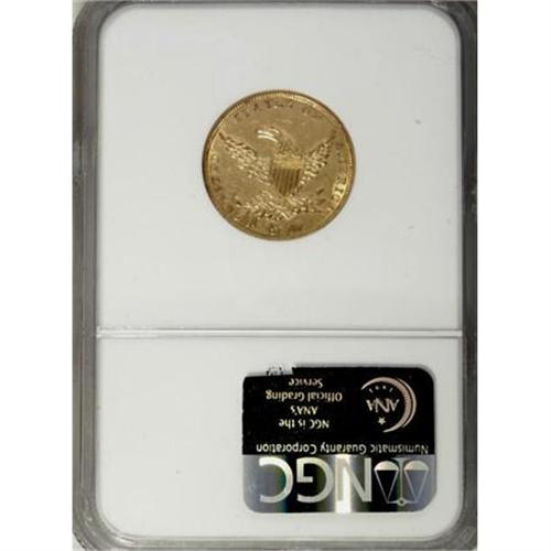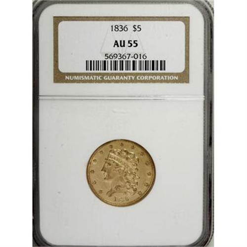 <B>1836 $5 AU55 NGC.</B></I> Second Head, Large Date, Breen-6509, McCloskey 4-D, R.2. Subtle orange accents visit the radiant fields of this well struck example. The portrait shows a small mark on the neck and minor highpoint wear, but it is pleasingly preserved otherwise.<BR><BR><B>Coin Engraver:</B> William Kneass<BR><BR><b>Shipping:</b> Coins & Currency (<a target="_blank" href="http://www.heritageauctions.com/common/shipping.php">view shipping information</a>)