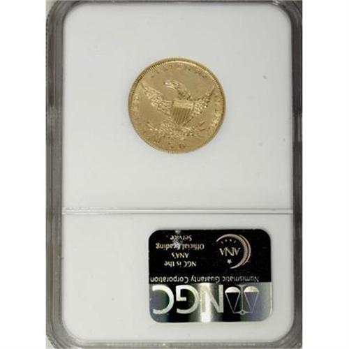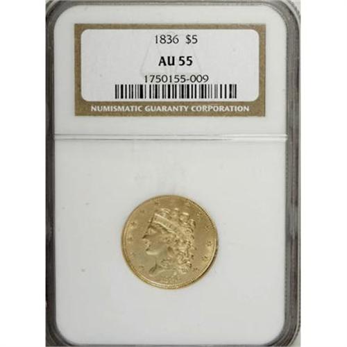 <B>1836 $5 AU55 NGC.</B></I> Second Head, Large Date, Breen-6509, McCloskey 4-C, R.3. Pale yellow-gold overall with subtle canary accents near the margins. Well-defined on the minimally marked reverse, though the stars and portrait show minor softness.<BR><BR><B>Coin Engraver:</B> William Kneass<BR><BR><b>Shipping:</b> Coins & Currency (<a target="_blank" href="http://www.heritageauctions.com/common/shipping.php">view shipping information</a>)