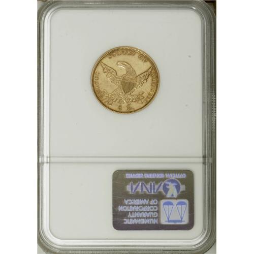<B>1836 $5 AU58 NGC.</B></I> Second Head, Breen-6509, McCloskey 4-D, R.3. A sharply struck coin that has bright luster and just a trace of friction. The fields are extremely clean for the grade and have good eye appeal.<BR><BR><b>Shipping:</b> Coin/Currency (<a target="_blank" href="http://www.heritageauctions.com/common/shipping.php">view shipping information</a>)