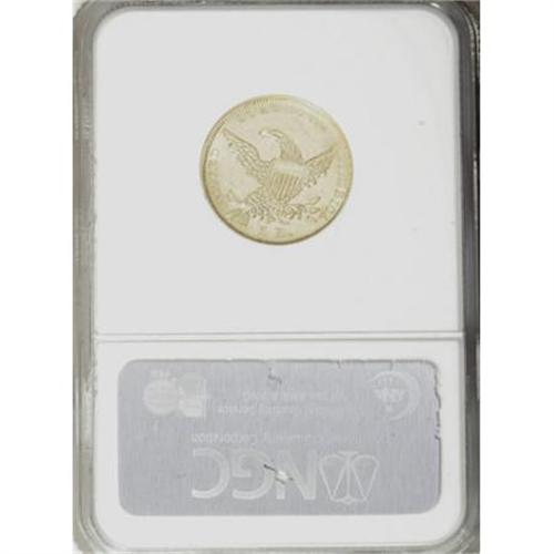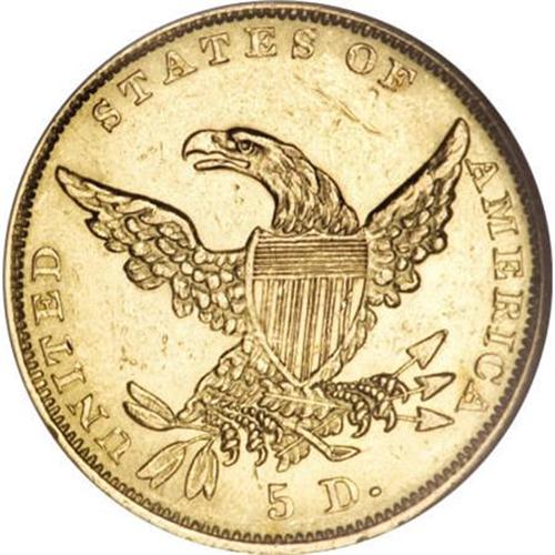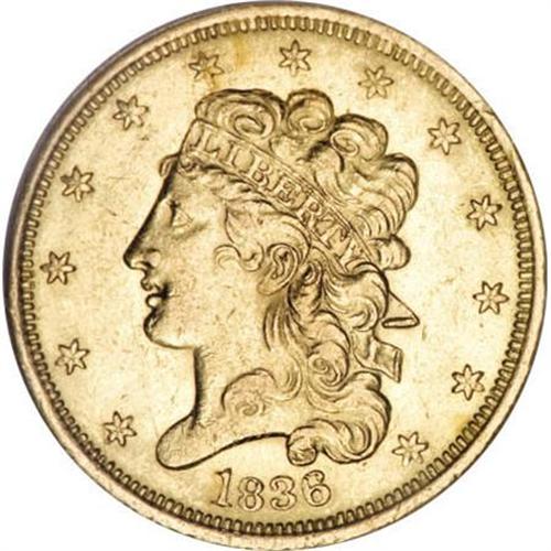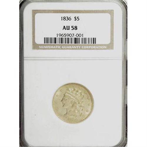 <B>1836 $5 AU58 NGC.</B></I> Third Head, Breen-6510, McCloskey 3-C, R.2. The bright lime-green and chartreuse surfaces display glassy, semi-prooflike fields. The design features are sharply rendered and the only noticeable wear occurs on the eagle's right (facing) wing tip. Wispy marks are noted in the fields and a sizeable abrasion appears on the upper reverse, just below ES OF. <BR><BR><B>Coin Engraver:</B> William Kneass<BR><BR><b>Shipping:</b> Coins & Currency (<a target="_blank" href="http://www.heritageauctions.com/common/shipping.php">view shipping information</a>)