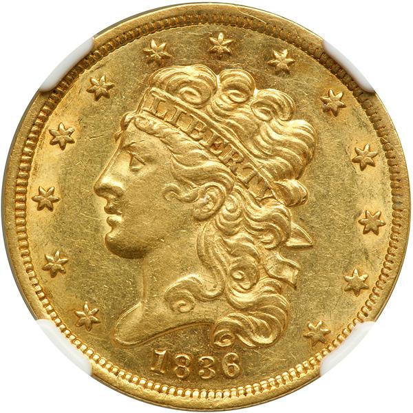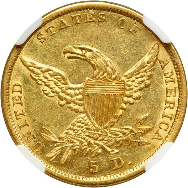 1836 $5 Classic Head. NGC graded AU-58. Second head. Breen-6509, McCloskey-4D. Block 8, double forehead curl. With berry in branch, no tongue, arrow feather over left edge of 5. Common variety. Lightly toned with plenty of luster still evident. The surface smooth and attractive (PCGS # 8174) .