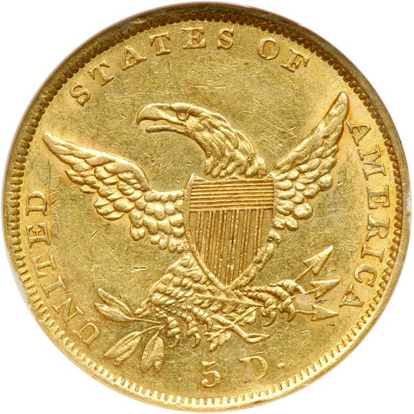 1836 $5 Classic Head. ANACS graded AU-58. Basically untoned and decidedly lustrous. In 1836, the big news of the day was President Andrew Jackson's political war on the Second Bank of the United States. He refused to sign the renewal of its charter and the bank went into decline before foldiing in 1840. The year before this half eagle was made, and the only time in its history, the American government under the same Pres. Jackson, paid off the national debt. Perhaps this is why many modern politicians consider Jackson a crank and a looney.