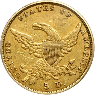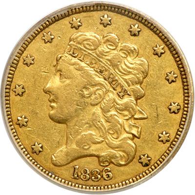 1836 $5 Classic Head. PCGS graded EF-40. Lightly toned around the devices, a well-struck example of the limited-issue William Kneass Type of 1834-38 (PCGS # 8174).